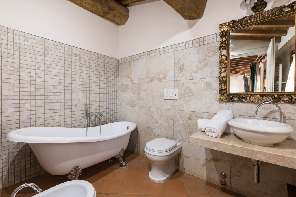Inside you will find a large open space with a comfortable sofa bed positioned in front of a typical tuscan fireplace.